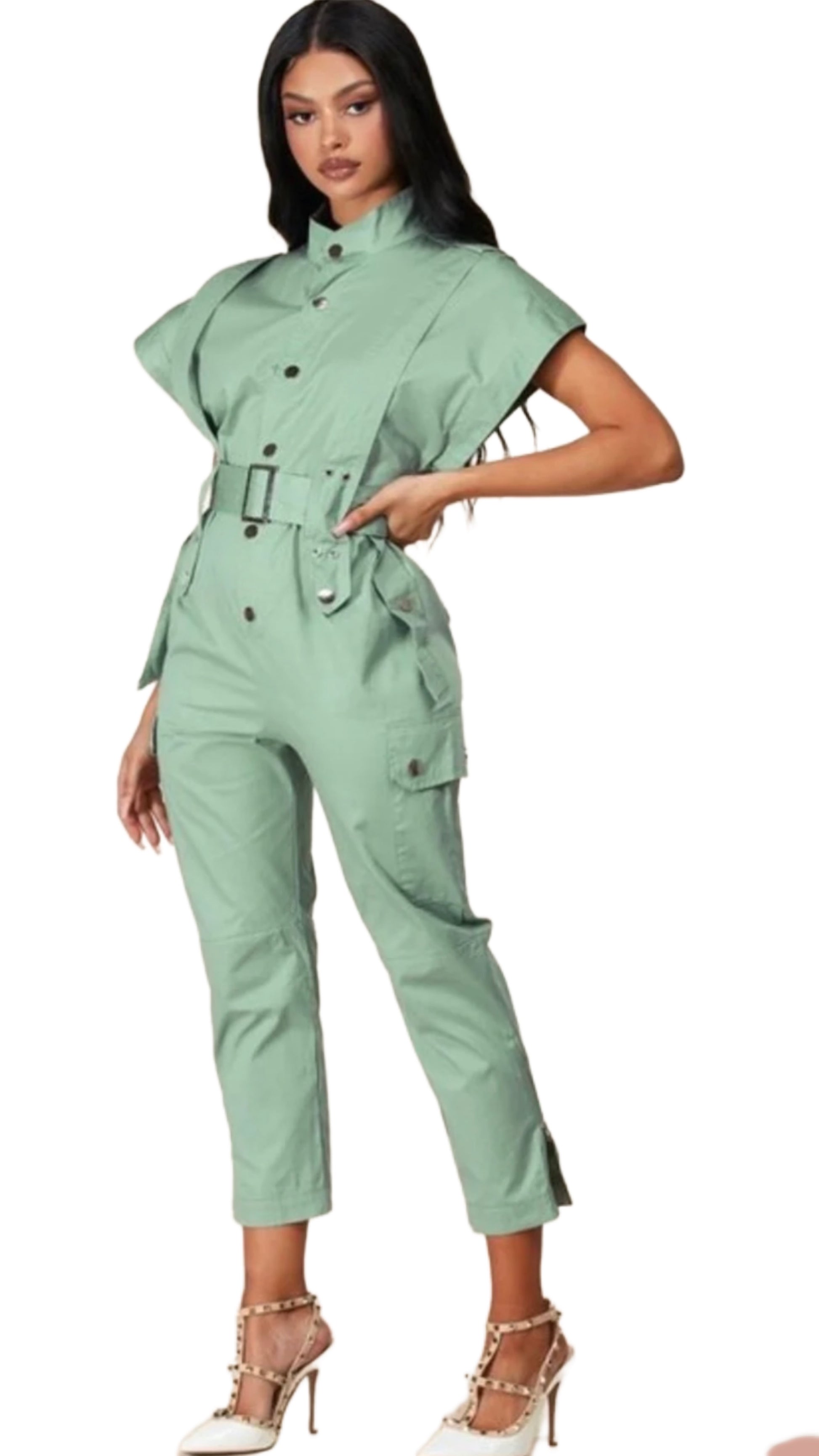 Sage utility jumpsuit features a high neck, oversized cap sleeves, cropped legs with zipped slit on the sides, and removable belt.